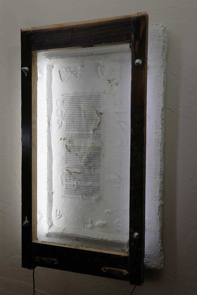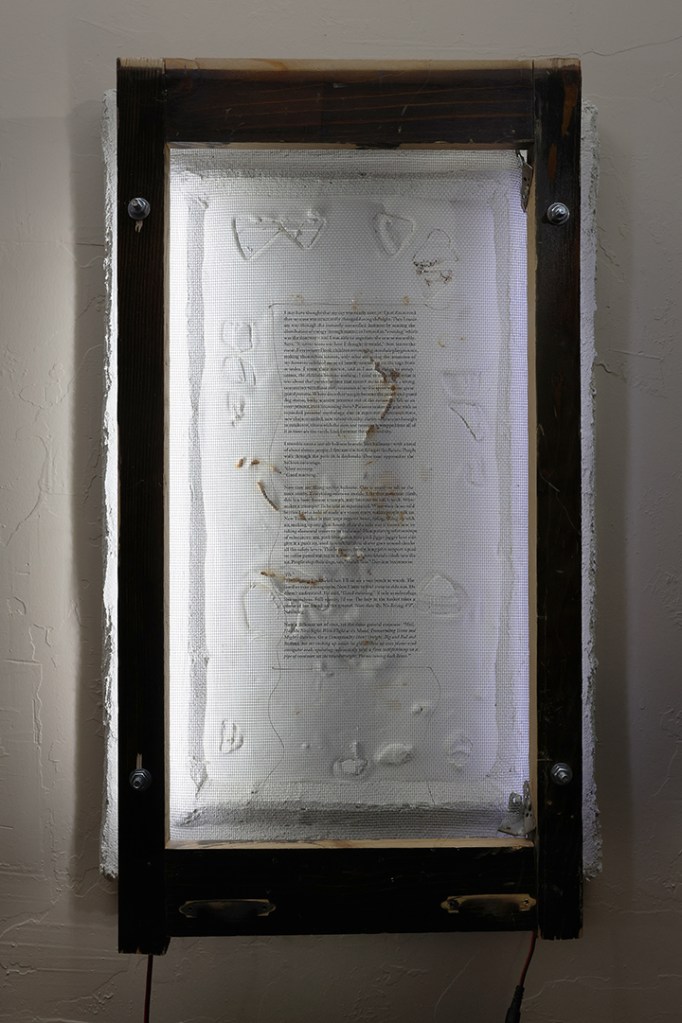 plaster, stucco, metal objects, metal screen, wood, laser print on transparency, LED lights, thread, hardware